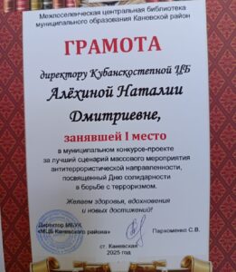 В преддверии Дня солидарности в борьбе с терроризмом, который отмечается 3 сентября, в Каневском районе, организованный Каневской Межпоселенческой центральной библиотекой прошел значимый творческий конкурс – муниципальный конкурс на лучший сценарий, посвященный этой важной теме. Мероприятие призвано не только привлечь внимание к проблеме терроризма, но и способствовать формированию у подрастающего поколения и широкой общественности понимания его опасности, а также важности единства и солидарности в противостоянии этому злу. Конкурс собрал талантливых авторов-библиотекарей, неравнодушных к вопросам безопасности и мира, готовых через силу слова и искусства донести до сердец и умов людей важные идеи. Жюри, тщательно оценивало представленные работы по ряду критериев: актуальность темы, оригинальность замысла, художественная ценность, воспитательный потенциал и практическая применимость сценария.