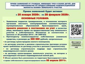 ✅Ведется прием заявлений об участии в мероприятии по получению компенсационной выплаты многодетным семьям, состоящим на учете в муниципальных образованиях Краснодарского края, взамен предоставления им земельного участка в собственность бесплатно, до 28 февраля 2026 года.